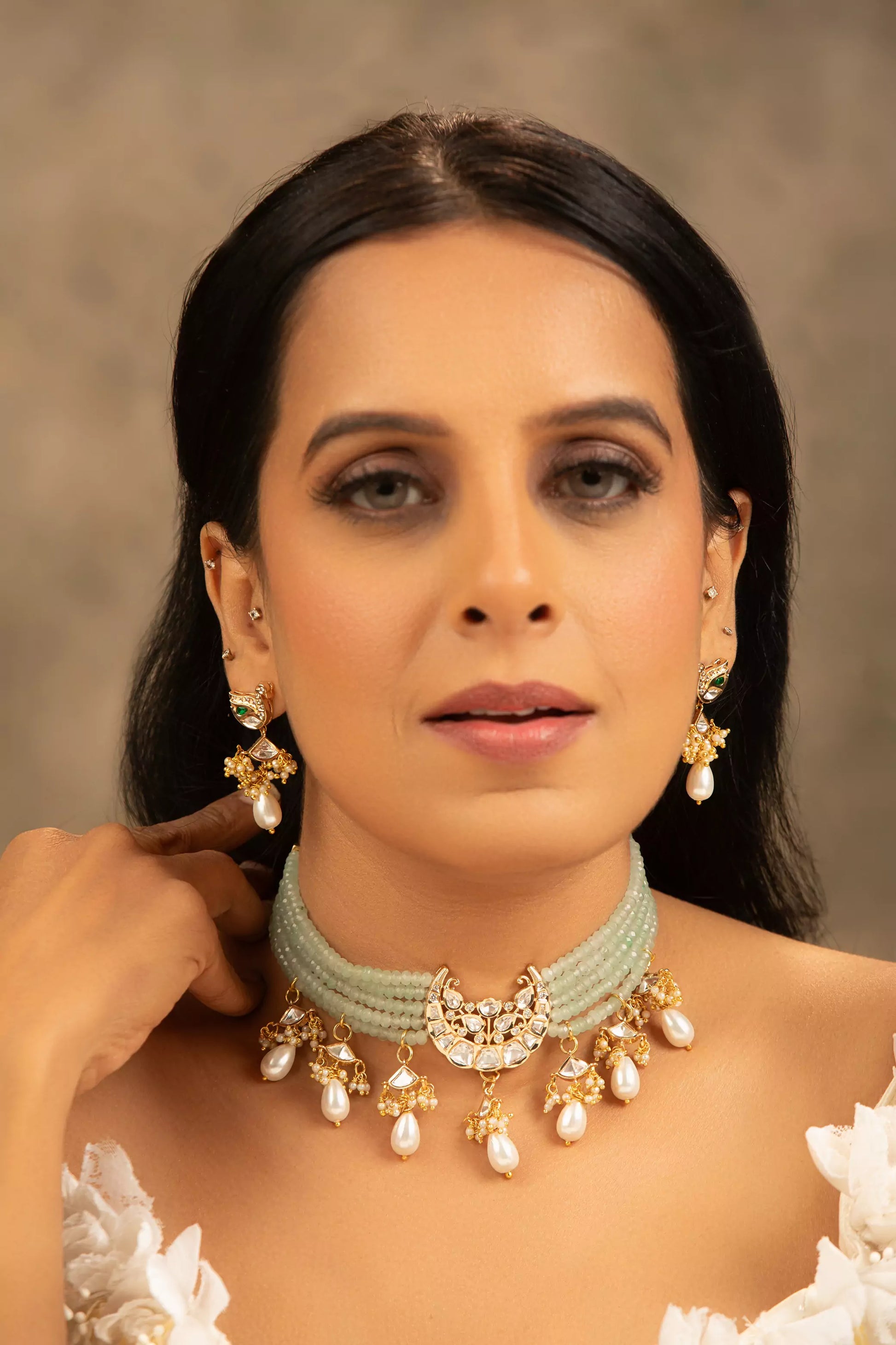 Laasya Green Beads White Polki And Pearl Necklace Set — a jewellery crafted with choker design and a pair of drop earrings.