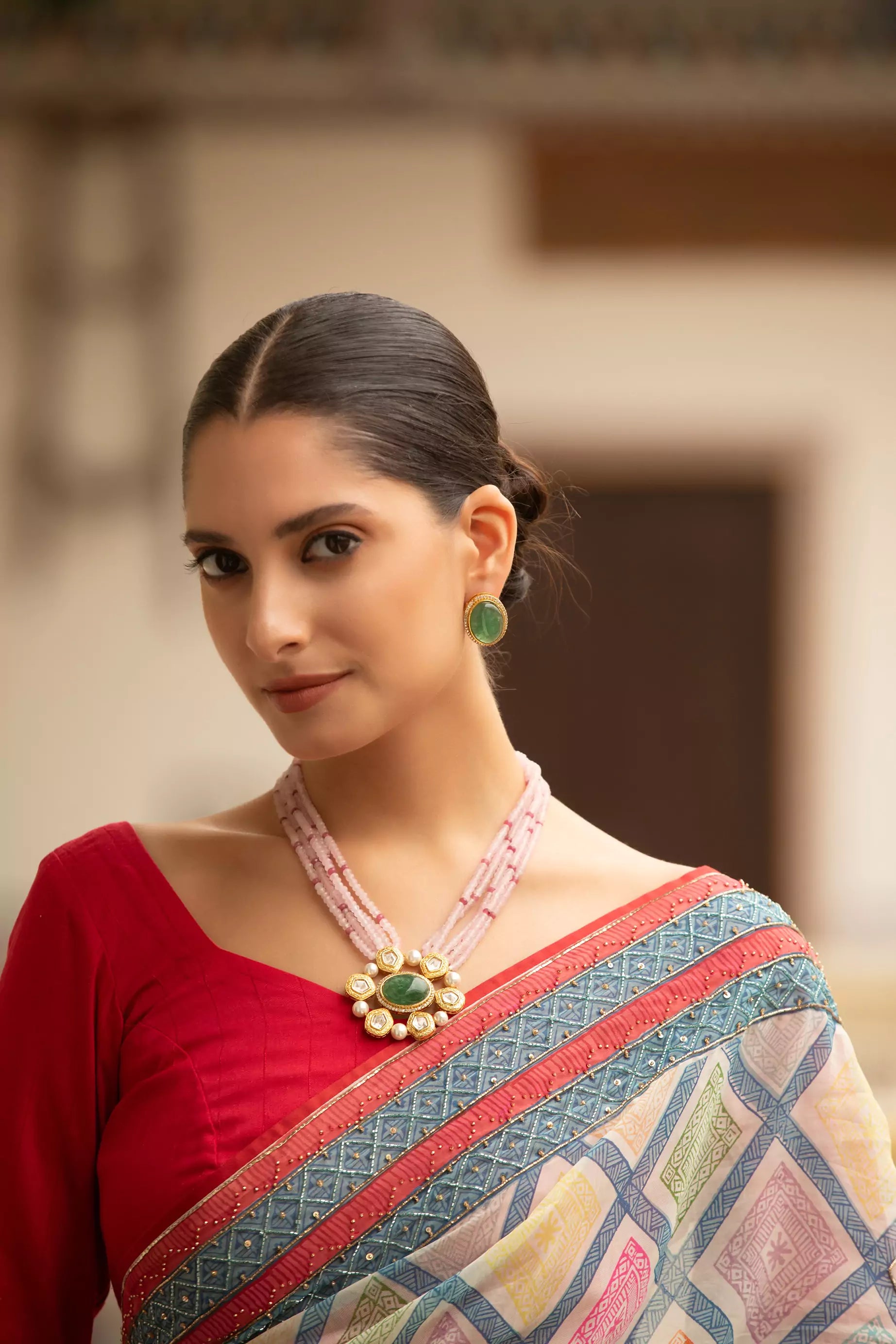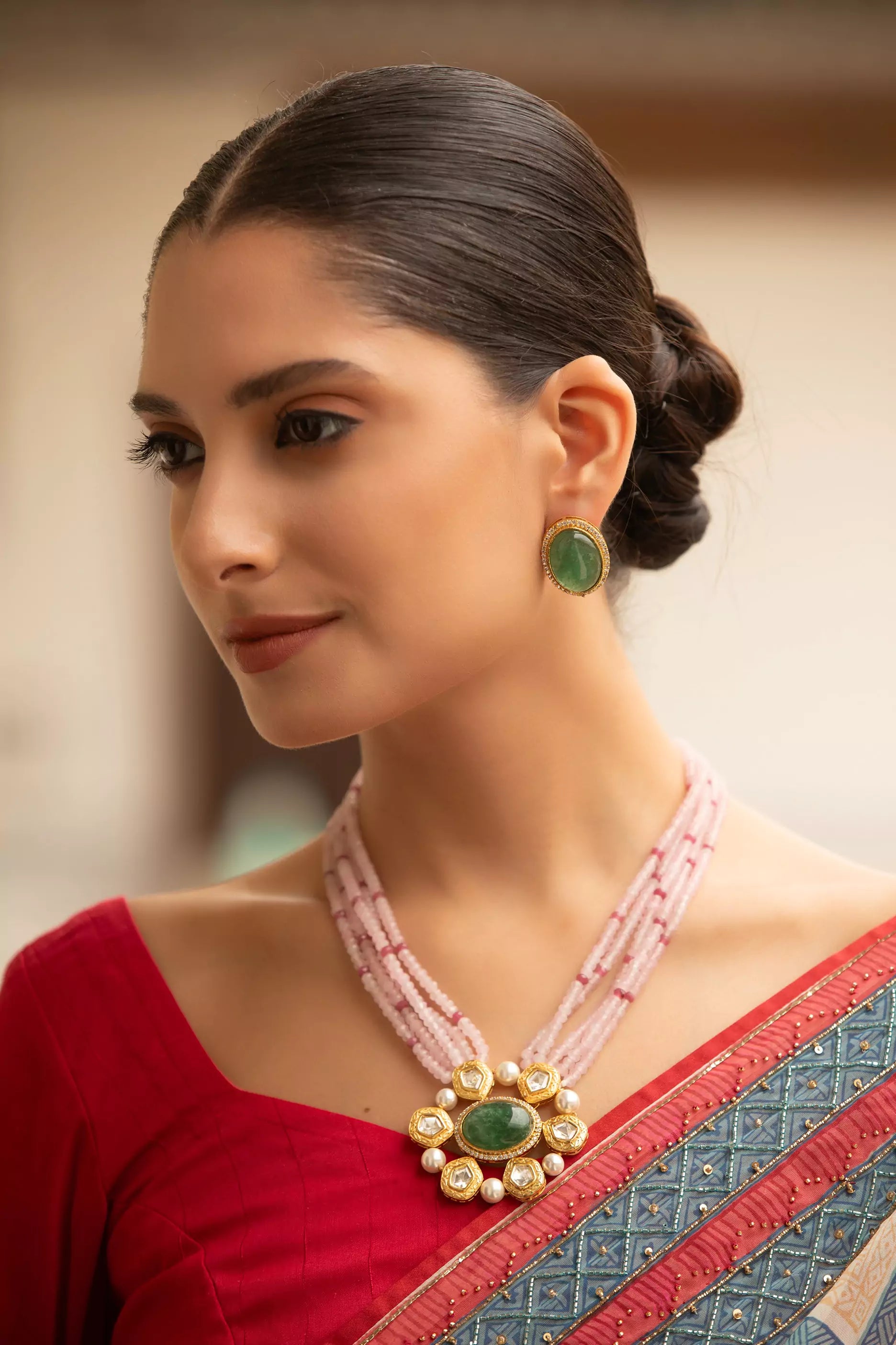 Noor-E-Deewan Necklace Set with Pink Beads & Green Polki Moissanite Pendant