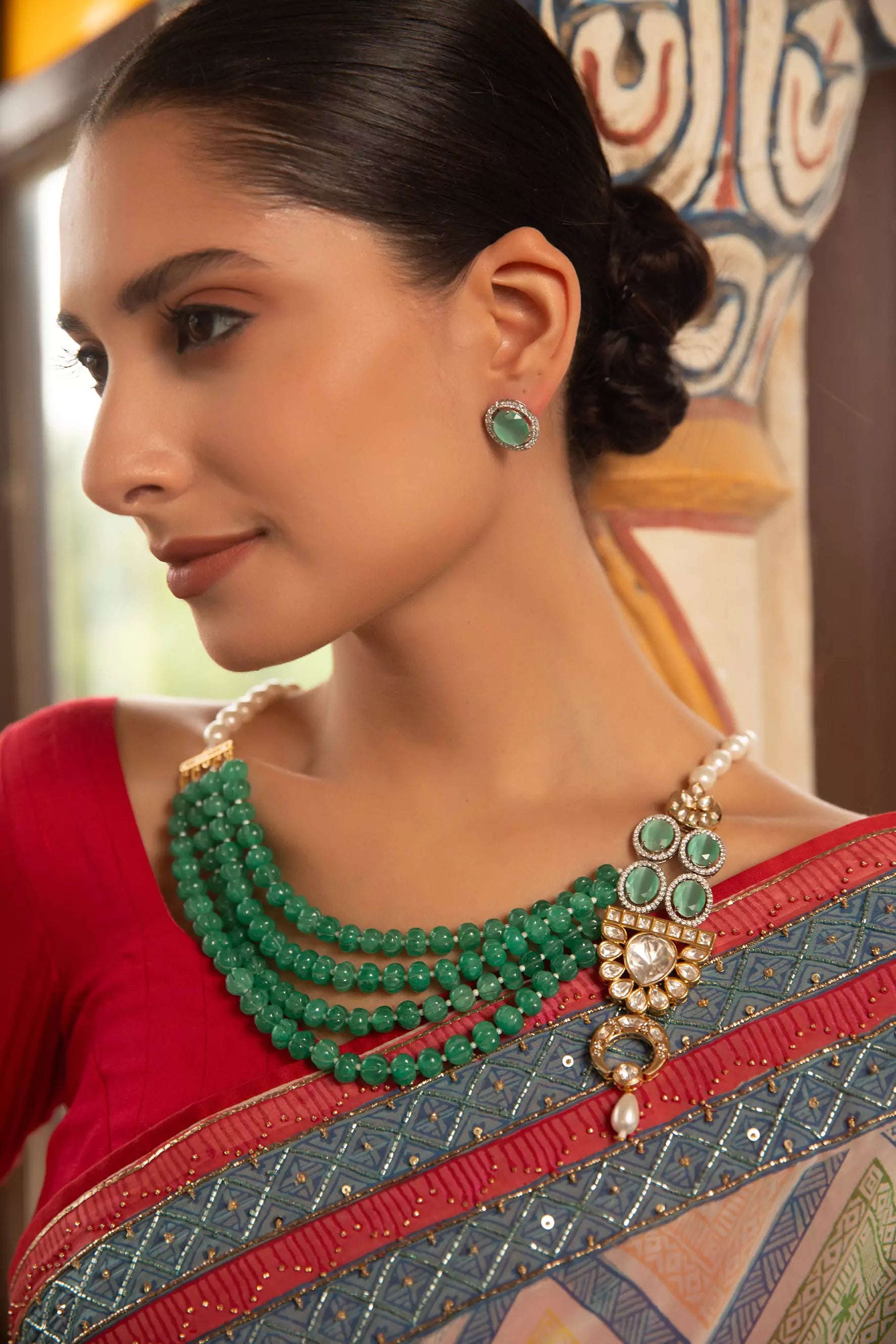Xago Rang Mahal Haar Necklace Set with Green Beads & Polki Moissanite Pendant — The Xago Rang Mahal Haar is a majestic necklace set crafted with strands of radiant green beads and a regal Polki Moissanite pendant, highlighted with pearl detailing.