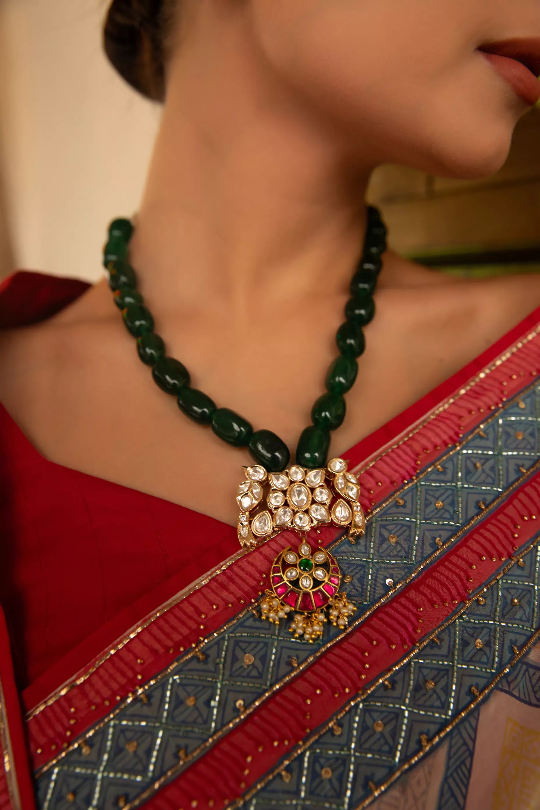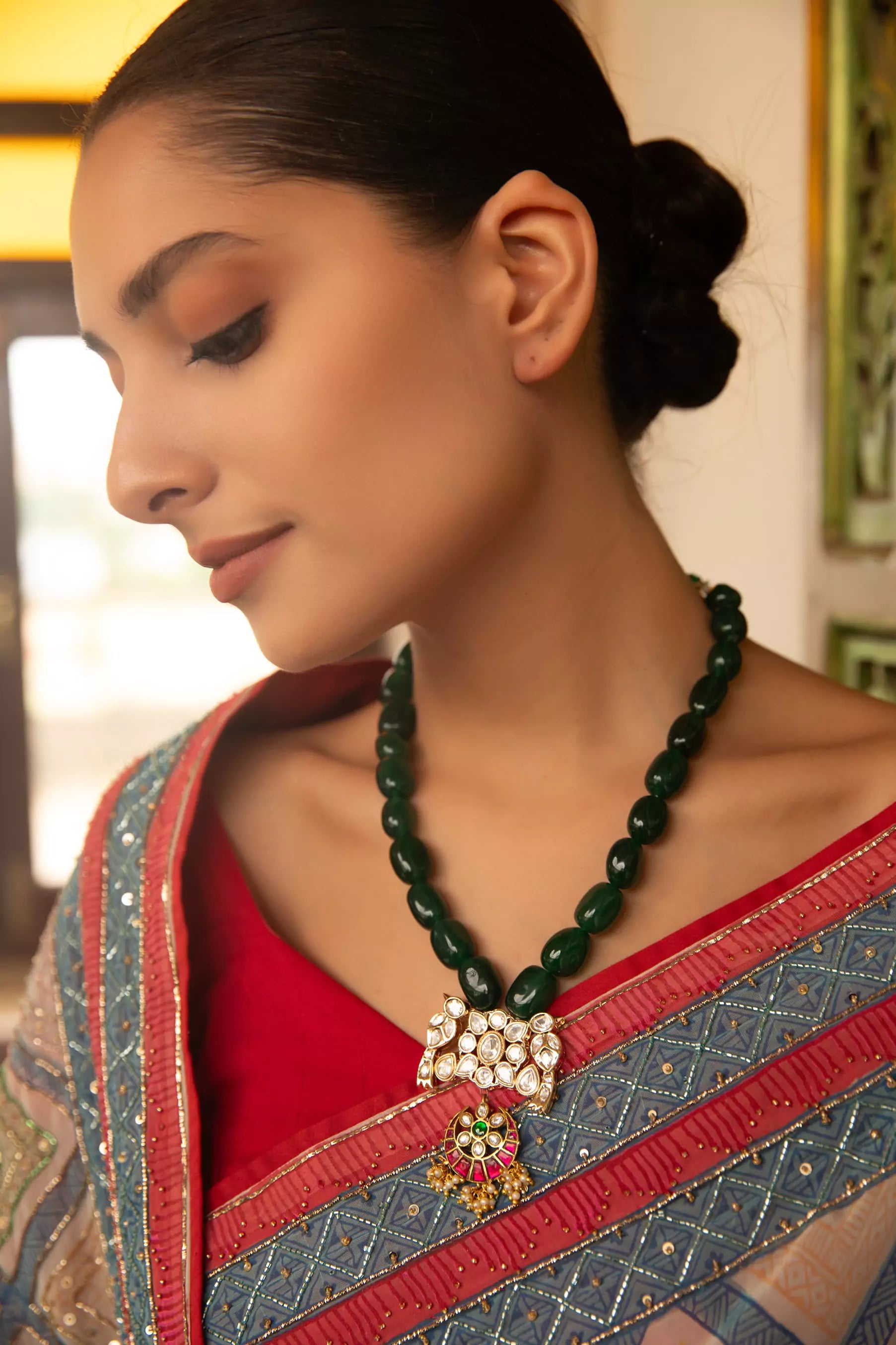 Sunehri Sheesh Necklace with Green Beads & Polki Moissanite Pendant