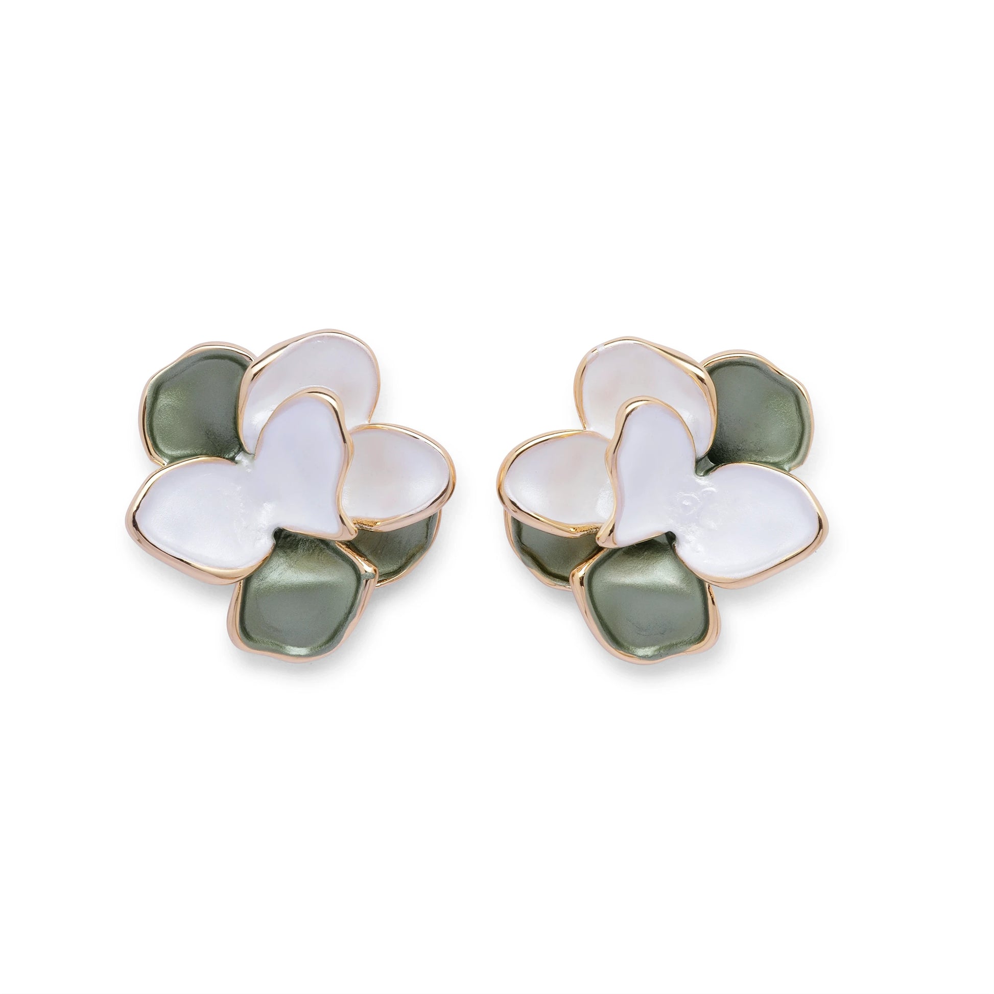 Verdant Bloom Studs — Fresh, feminine, and timeless - the Verdant Bloom Studs are inspired by nature in full bloom. Featuring layered floral petals in soft white and verdant green enamel, outlined with a refined gold finish, these studs add a graceful pop of color to everyday and occasion looks alike. Lightweight and elegant, they’re perfect for brunches, workdays, and festive styling.