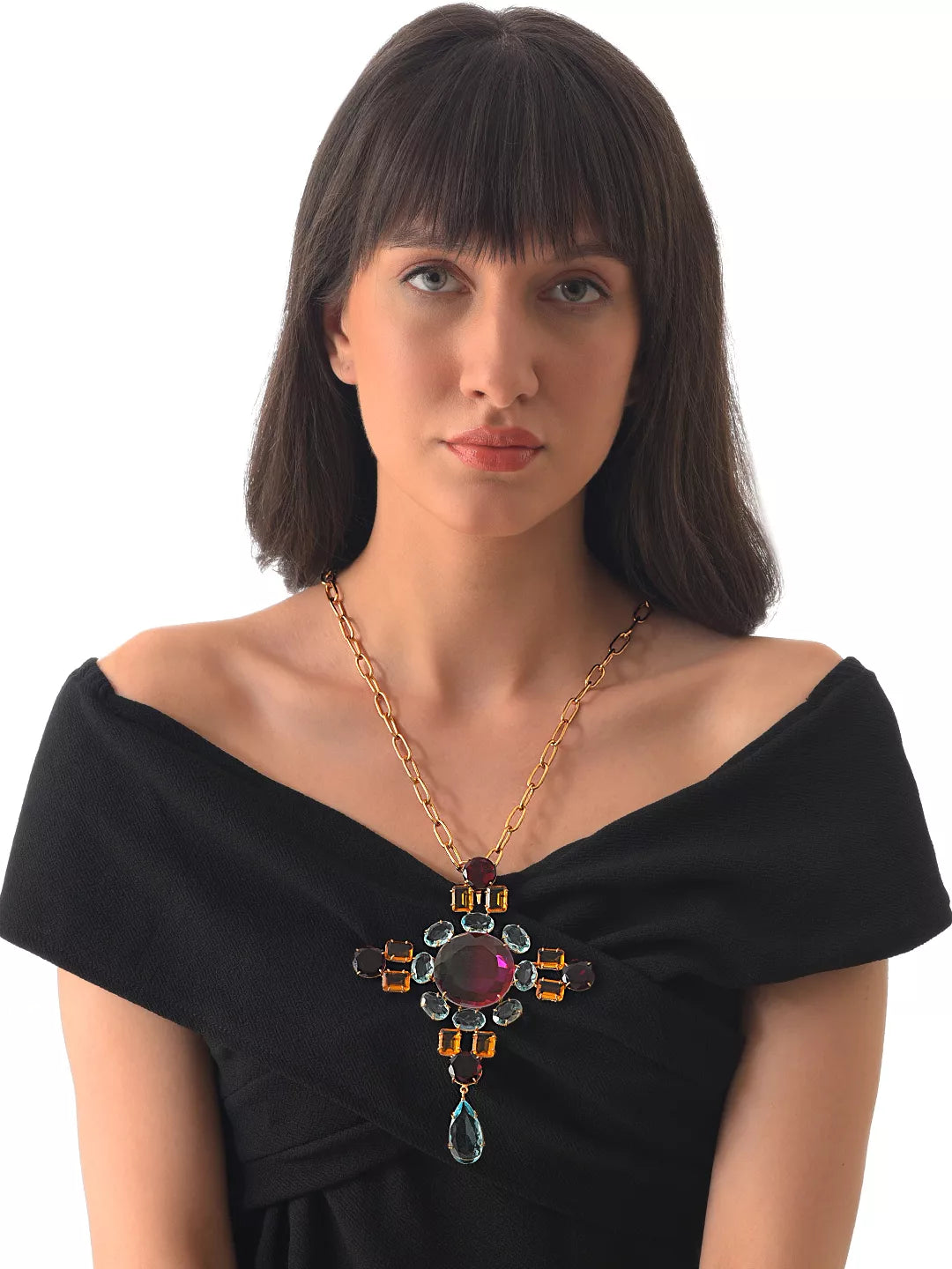 Suspended on a refined gold chain, Celestia captures the balance between bold expression and timeless elegance — making it the perfect conversation piece for soirées, artful brunches, and festive evenings.