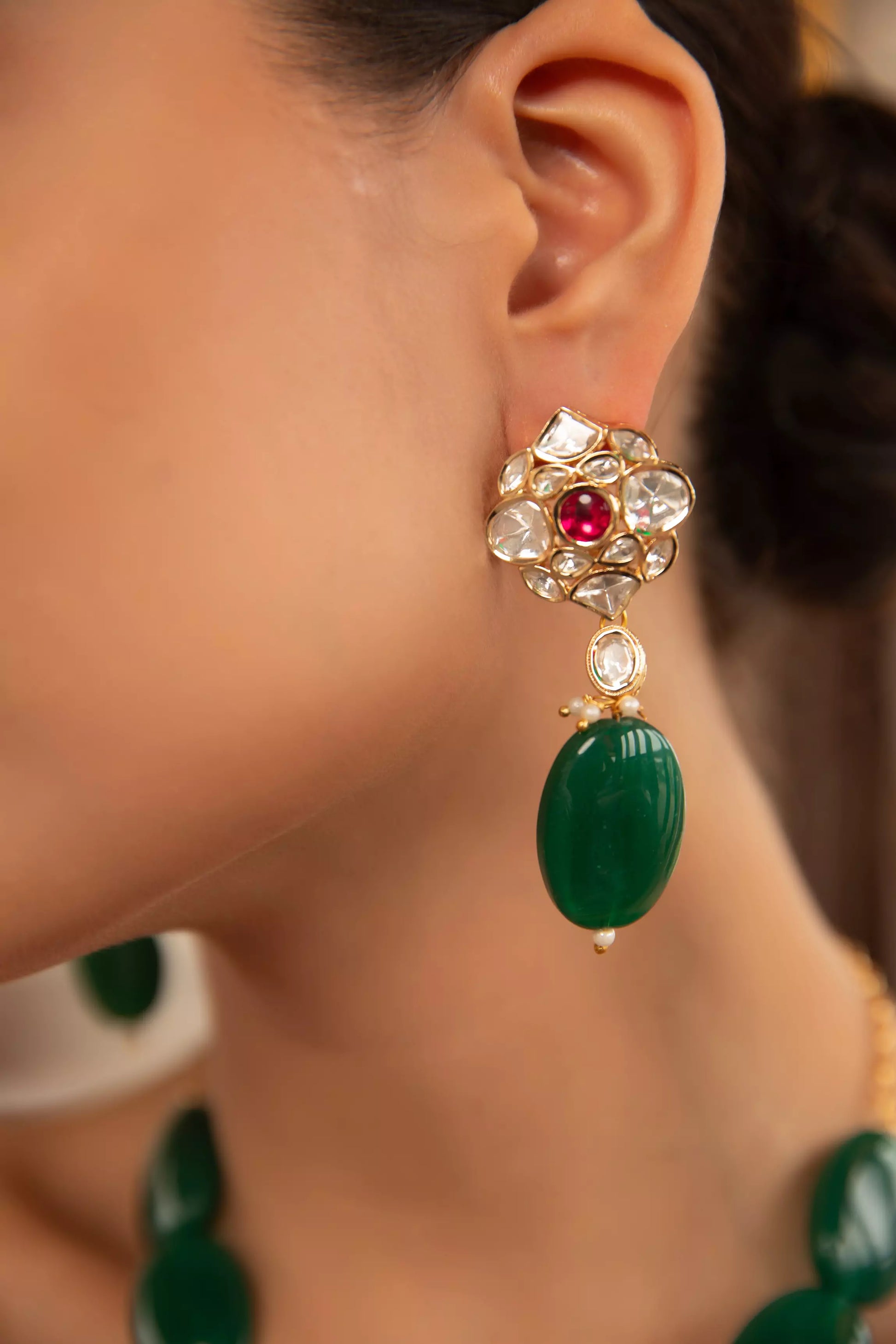 Xago Ranjhana Necklace Set with Green Beads & Polki Moissanite Pendant —The Xago Ranjhana Necklace Set is a striking creation featuring bold green oval beads and a handcrafted Polki Moissanite pendant, enriched with ruby accents and pearl detailing.