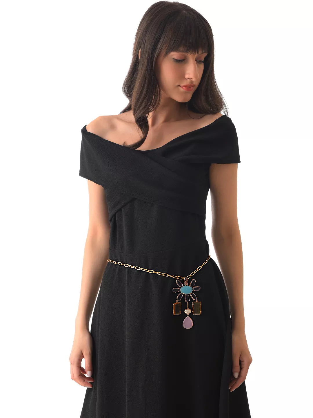 Handcrafted with an exquisite medley of Turquoise, Rose Quartz, Citrine, Mother of Pearl, and Amethyst, this pendant radiates warmth and feminine energy. Set on a chic gold link chain, its sculptural composition evokes a celestial bloom — bold, luminous, and endlessly elegant.